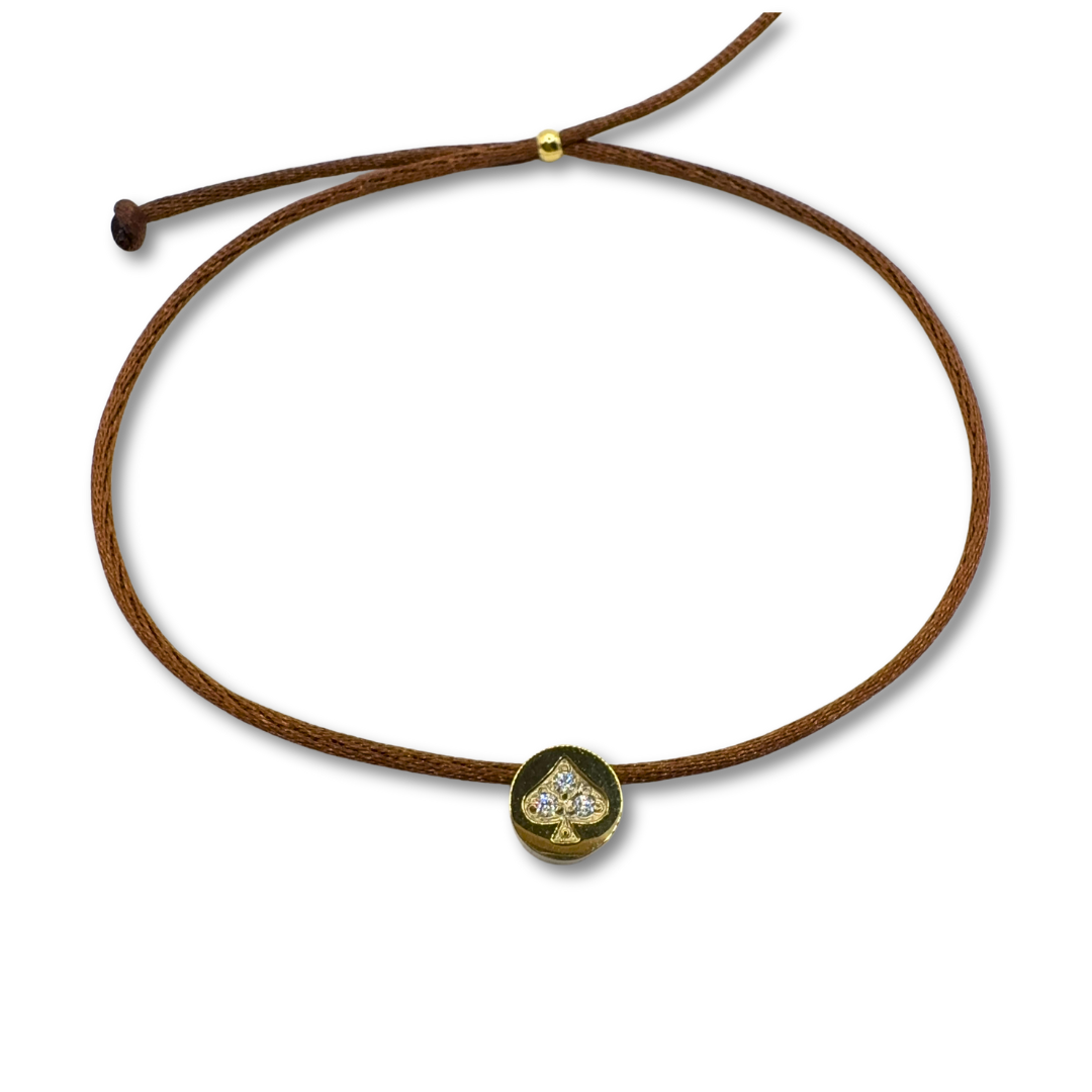 Feita em fio de seda premium na cor caramelo e pingente em banho de ouro 18k, ela traz o símbolo de espadas, representando força interior, coragem, sabedoria e proteção.