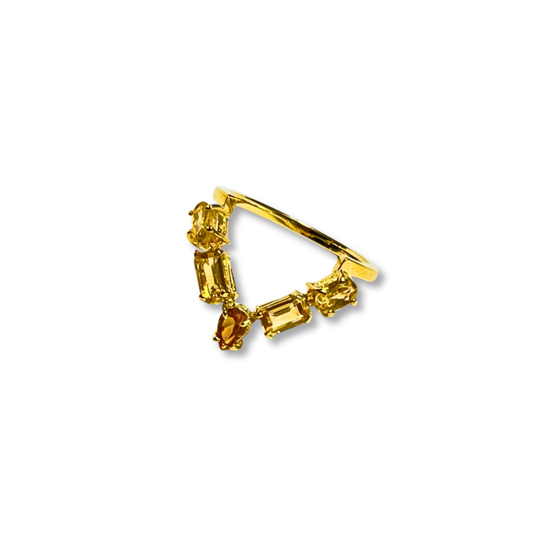 Cada detalhe do anel é um testemunho do nosso compromisso com a qualidade e o estilo. O Citrino em três variações de corte - Citrino Rio Grande em formato de gota, Citrino Médio em formato octogonal e Citrino Claro em formato oval - totalizando 1.36 CT, adiciona um toque de fascínio natural a esta peça excepcional.