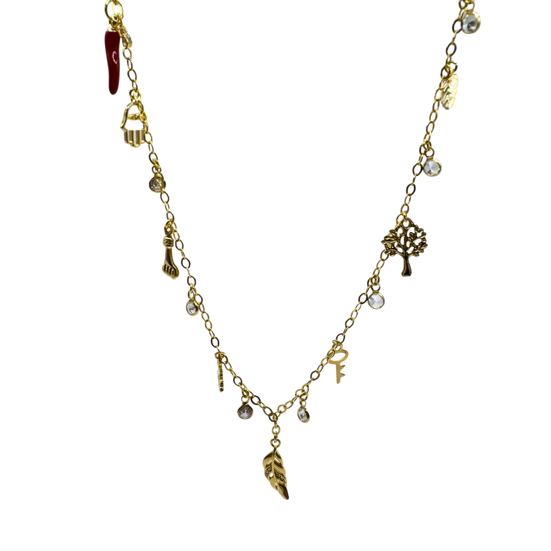 O colar Patuá com banho de ouro 18k é uma joia marcante que une estilo, significado e tendência em uma única peça. Com um design moderno, ele reúne um mix de pingentes de proteção, sorte e fé, criando um visual sofisticado e cheio de personalidade.